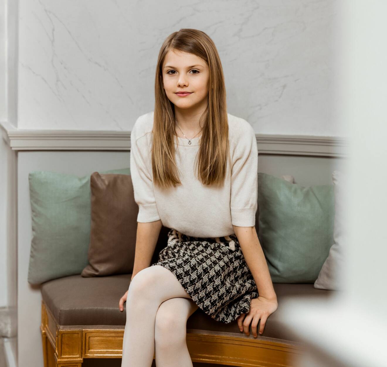 En elegant svängd bänk – och så födelsedagsprinsessan som möter vår blick, med ett silverhjärta i halsgropen och klädd i kort rutig kjol.