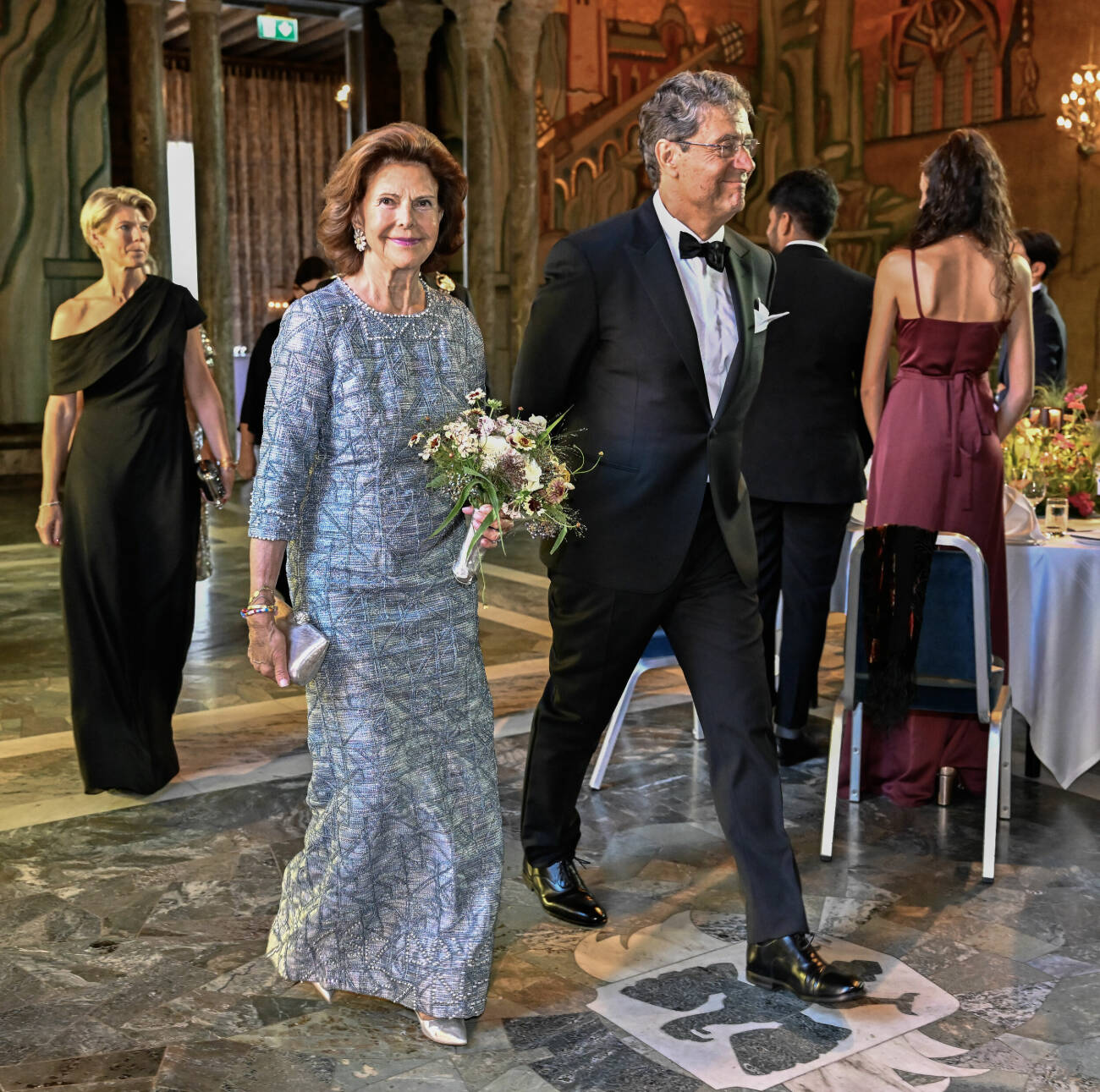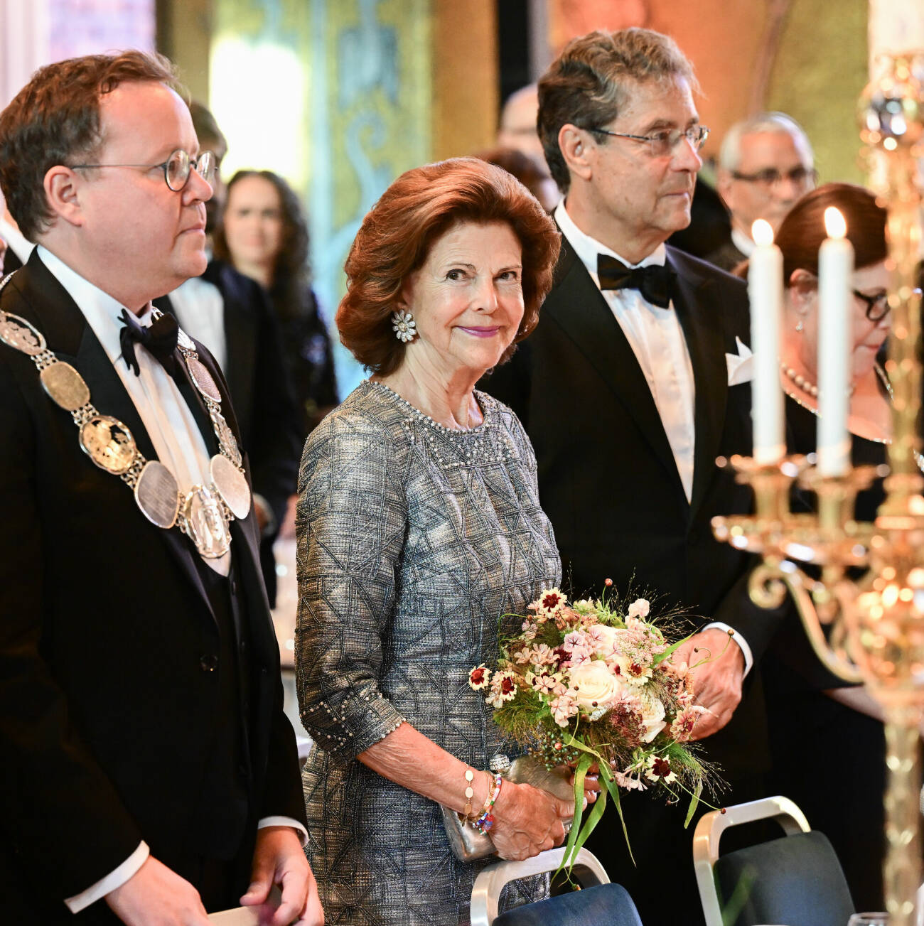 Kungaparet är hedersgäster och sitter just nu vid honnörsbordet i den glimmande Gyllene salen.