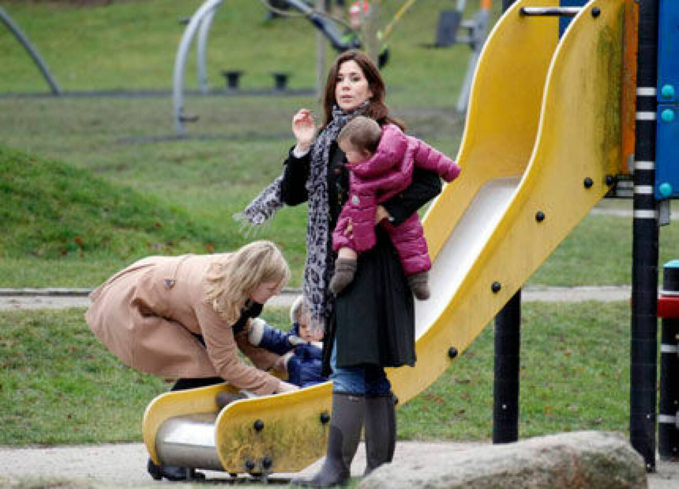 Kronprinsessan Mary var ute i lekparken i närheten av Marselisborg häromdagen, i kappa, halsduk och gummistövlar.