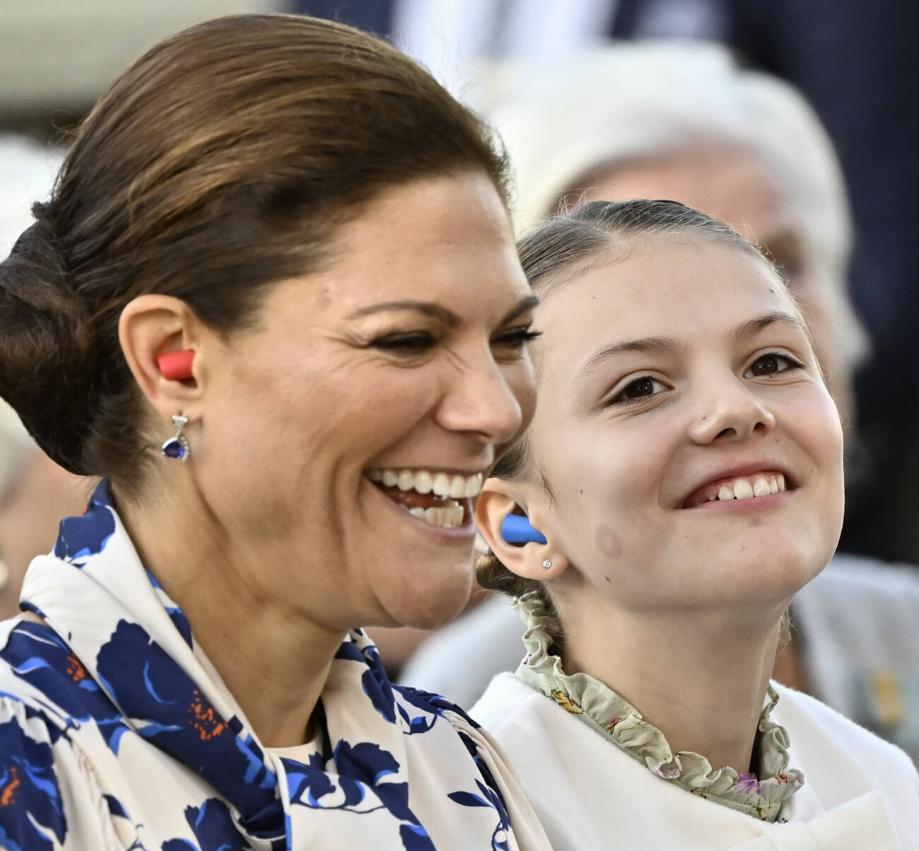 Här kommer kronprinsessfamiljen!Kloka Victoria hade med sig öronproppar – blåa till Estelle och röda till sig själv..